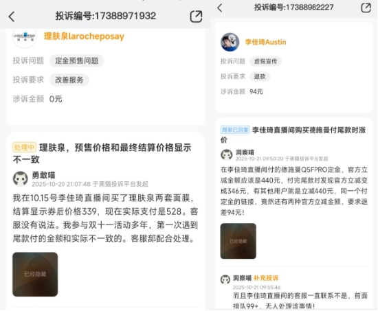 还有消费者称,在其直播间买了两套理肤泉面膜,结算显示券后价为339元,实际支付却为528元,差额近200元,”参加“双十一”活动多年,第一次碰到尾款和实际不一致”。