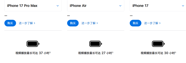 据苹果官方数据也显示,iPhone Air在视频播放续航上表现平平,仅为27小时,远低于iPhone 17 Pro Max的37小时,也落后于标准版iPhone 17的30小时。
