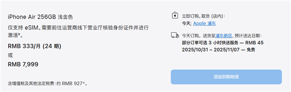 iPhone Air线上渠道的供应情况进一步印证了市场的平淡反应。记者在苹果官网查询发现,其所有颜色的256GB版本均有现货,支持即时取货或3小时配送上门;而512GB与1TB版本则需排队至10月31日至11月7日方能发货。