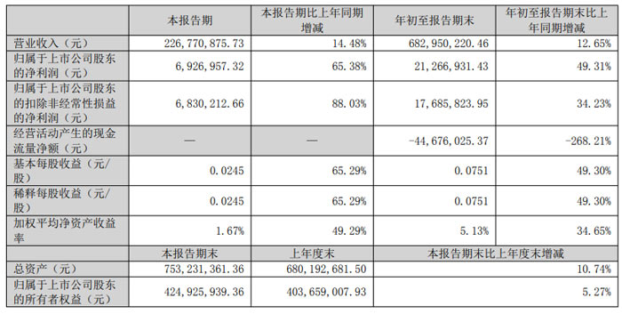 从年初至报告期末(2025 年 1-9 月),公司累计实现营业收入 6.83 亿元,同比增长 12.65%,销售规模持续扩大;归属于上市公司股东的净利润 2126.7 万元,同比增长 49.31%,盈利水平稳步攀升。
