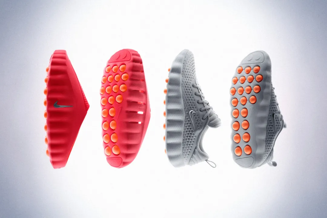 这两款鞋最显著的特征,是其鞋底嵌入的 22 个独特的橙色泡棉节点。根据耐克的说法,这些节点在使用者行走时,能像“活塞与万向节”一样独立上下移动。