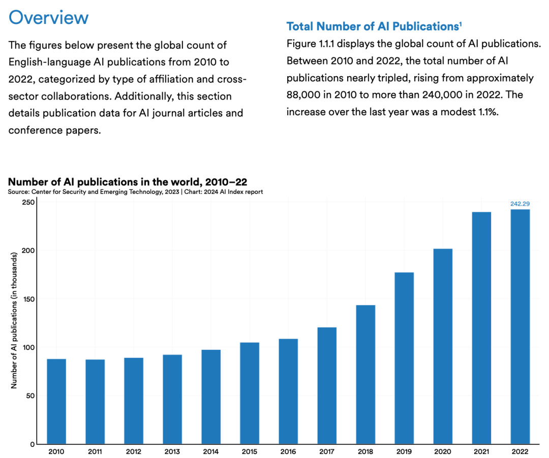 AI Index 指出,2010–2022 年全球 AI 论文总量近乎三倍增长(约 8.8 万 → 24 万 +)。