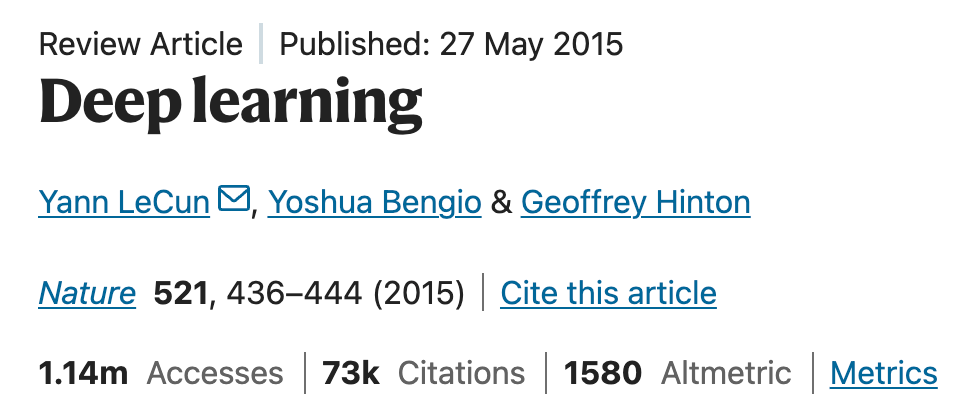 从 1986 年的反向传播,到 Nature 在 2015 年发表了 LeCun、Bengio、Hinton 的综述《 深度学习 》,再到 Bengio 团队关于「表示学习」的综述,这些大牛们的论文成了后来论文写作中的标准理论与背景引用来源。