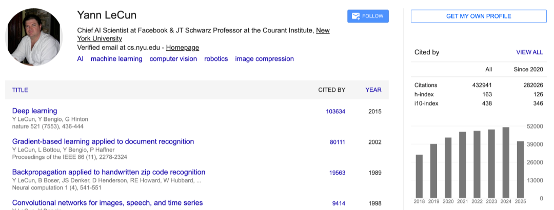 同为图灵奖三巨头的 Yann LeCun 也有 43 万 + 的引用。