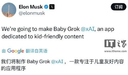 《马斯克宣布将推出儿童版 AI 应用“Baby Grok”,暂未披露功能细节》