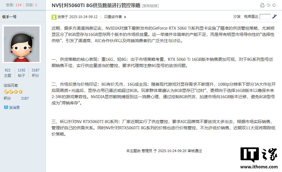 IT之家 10 月 25 日消息,博板堂渠道人士昨日爆料称,英伟达针对 GeForce RTX 5060 Ti 系列显卡实施了精准的供货管控策略,尤其明显区分了 8GB 显存与 16GB 显存两个版本的市场投放量。