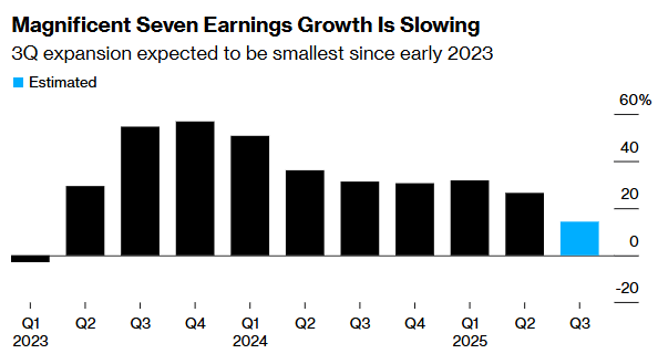 数据显示,七大科技巨头预计在第三季度的利润增长率将为 14%,低于第二季度的 27%。尽管这一增长率几乎是标普500指数整体预期利润增长 8%的两倍,但这也是该板块自 2023 年第一季度以来增长速度最慢的一次。