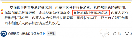 值得一提的是,胡晓冰在出任授信审批部副总经理后,负责信贷审批核心业务。虽然他并不常出现在公开报道中,但是在二十多天前,也就是9月28日,他还以该身份,参与内蒙古农商银行与交通银行共同举行的交流座谈会。