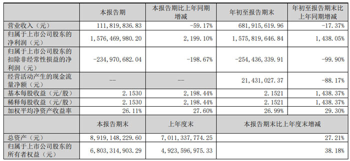 净利润大幅增长但依赖非经常性损益:本报告期归属于上市公司股东的净利润 15.76 亿元,同比激增 2199.10%;年初至报告期末该指标为 15.76 亿元,同比增长 1438.05%。核心驱动因素是 “出售瑞典 Silex 控股权” 产生的非经常性损益 —— 报告期内非流动性资产处置损益达 21.75 亿元,占非经常性损益总额的 120% 以上。若扣除非经常性损益,本报告期归属于上市公司股东的净利润为 – 2.35 亿元,同比下降 198.67%;年初至报告期末扣非净利润为 – 2.54 亿元,同比下降 99.90%,反映主营业务仍面临盈利压力。