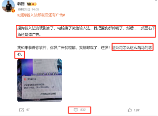 昨日,拥有888.9万粉丝的资深车评人韩路于微博发文称:“搜狗输入法流氓到家了,都卸载了,然后……桌面右下角还是弹广告。”韩路不解道:“我如果装着你软件,你弹广告我理解,我都卸载了,还弹!”