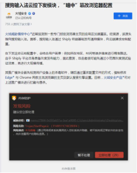 9月21日,火绒安全发布技术报告,称监测到一款专门锁定浏览器主页的应用正加速蔓延。经溯源,该源头指向搜狗输入法,搜狗输入法通过Shiply终端基础发布通用模块,向云端请求控制配置。在下发这些云控配置中,会结合用户画像,如所在地区、时间等诸多维度进行精准推送。此外,推广模块会通过篡改配置文件的方式,强制修改Edge与Chrome两款主流浏览器的主页及默认搜索引擎设置。