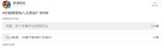 据新浪财经此前发起的一份用户投票,对于能否接受输入法加广告这一问题,556人的投票中,仅23人表示可以接受,占比仅约4.14%;另外的533人均不能接受输入法插入广告,占比高达95.86%。