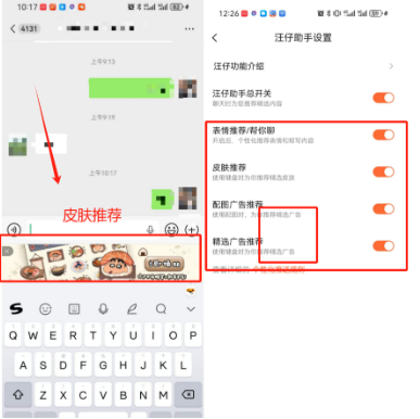 《BUG》栏目注意到,在搜狗输入法汪仔助手(安卓版)设置选项下,正常安装不刻意关闭状态下,搜狗输入法默认可向用户推荐表情、精选皮肤、精选广告等选项。而这,也对应着搜狗不同类型的广告及弹窗类型。