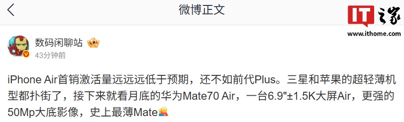 IT之家 10 月 27 日消息,博主 @数码闲聊站 今日发文透露,iPhone Air 首销激活量远远远低于预期(博主使用了三个“远”字来表达该机的销量不如预期),还不如前代 Plus。博主直言,三星和苹果的超轻薄机型都扑街了。