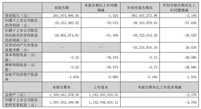 营收端:本报告期(单三季度)实现营业收入 2.62 亿元,同比下降 1.42%;年初至报告期末(1-9 月)累计营收 6.81 亿元,同比下降 2.16%,营收规模保持相对稳定,短期波动主要受行业整体需求节奏影响。