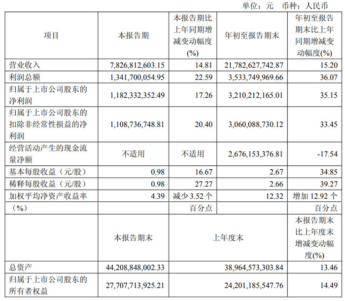 在每股收益方面,公司前三季度基本每股收益为 2.67 元,同比增长 34.85%;稀释每股收益 2.66 元,同比增长 39.27%,股东回报水平显著提升。加权平均净资产收益率方面,前三季度达 12.32%,较上年同期增加 12.92 个百分点,资产运营效率持续优化。