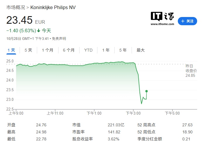 飞利浦方面回应表示:对此高度重视,并已按照监管要求提交了相关材料。受此消息影响,飞利浦股价下跌 5.63%,目前市值约 221 亿欧元(IT之家注:现汇率约合 1830.08 亿元人民币)。