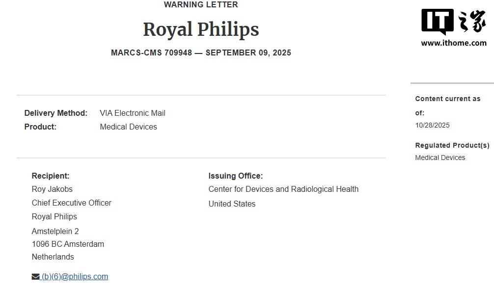 IT之家 10 月 28 日消息,美国食品药品监督管理局(FDA)今日公布警告信:检查发现,皇家飞利浦(Royal Philips)公司在美国 Bothell、Reedsville 和荷兰工厂生产的设备存在掺假问题。