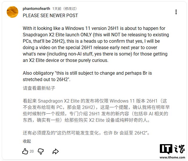 他进一步解释称,“26H1”的主要目的是为新硬件提供平台支持,而非完整功能更新,其中的一部分功能预计将在 2026 年下半年通过 26H2 大版本更新推送至现有用户。