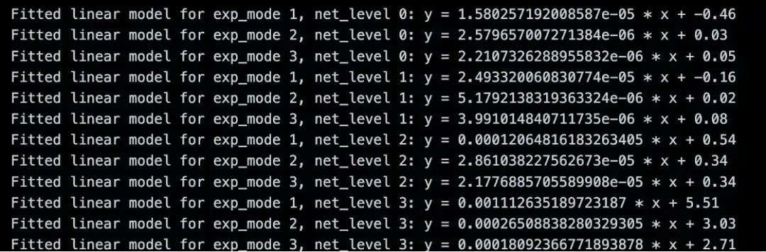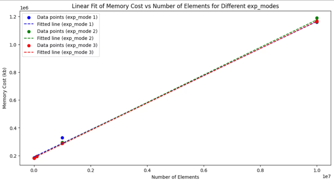 我们对于内存消耗建模为 y = a n+ b;y 为内存峰值,n 为需要计算的元素数量,a 为平均一个元素的内存消耗,b 为程序与元素数量无关的内存开销。