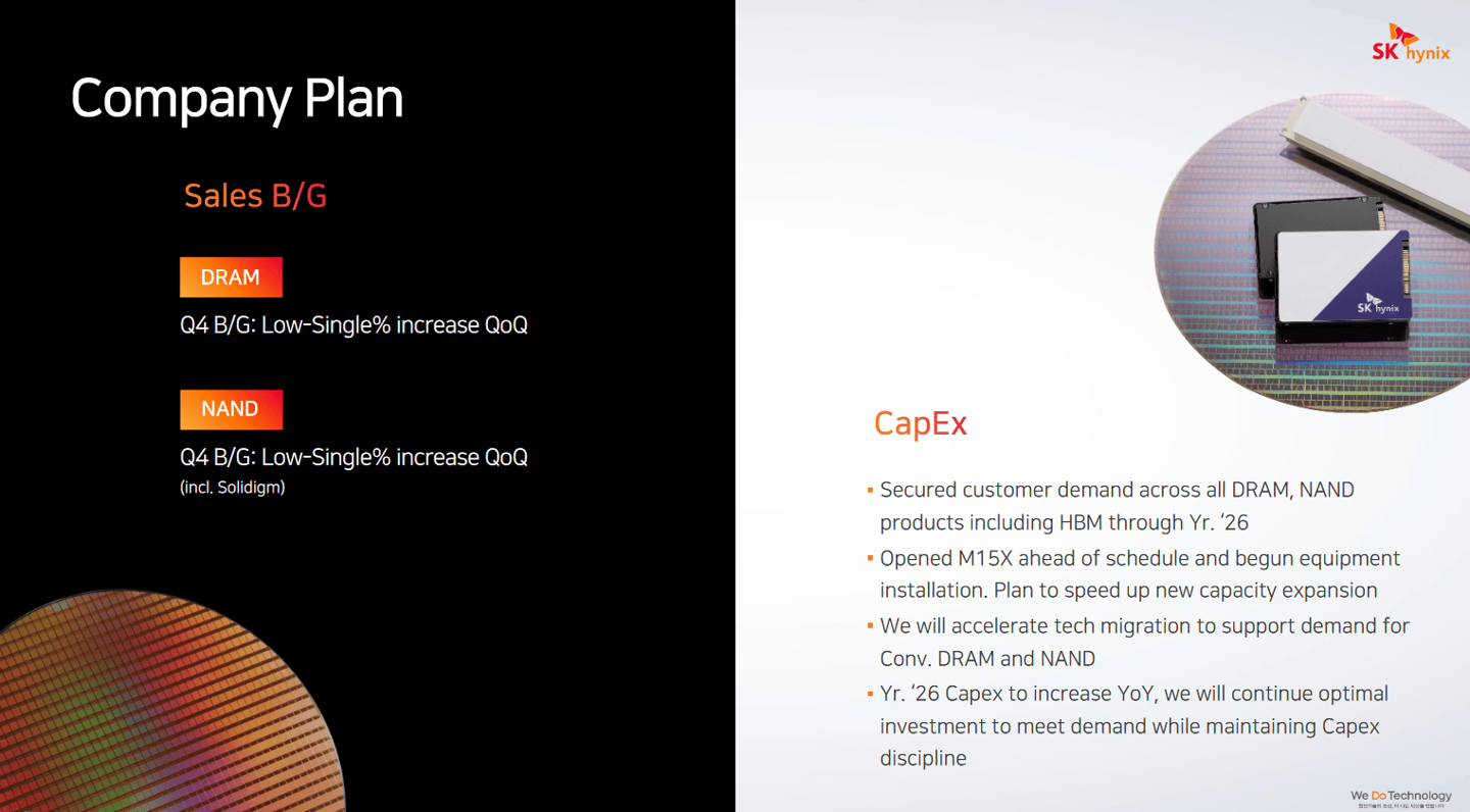 SK 海力士财务担当副社长金祐贤表示:“鉴于客户需求强劲,我们明年不仅 HBM,包括 DRAM、NAND 产能均已售罄。甚至有客户提前购买了 2026 年的传统存储芯片。”
