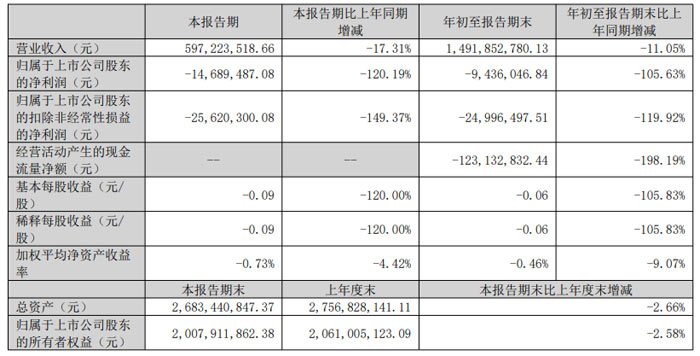 营收端:单季度实现营业收入 5.97 亿元,较上年同期下降 17.31%;年初至报告期末(1-9 月)累计营收 14.92 亿元,同比减少 11.05%,主要受下游需求波动及销售收款节奏变化影响。