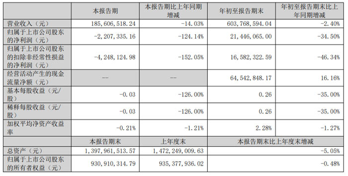 本报告期(单三季度)公司实现营业收入 1.86 亿元,同比下降 14.03%;归属于上市公司股东的净利润为 – 220.73 万元,同比下降 124.14%;扣除非经常性损益后的净利润为 – 424.81 万元,同比下降 152.05%。