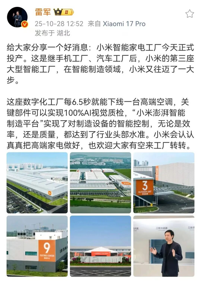 小米也在补足自身在制造及品控的短板。10月28日,小米智能家电工厂一期竣工,这是小米空调的主要生产基地,预计每6.5秒即可下线一台高端空调,每平米年产能达51台,峰值年产能可达700万套,预计年产值140亿元,将于明年开启空调产品的大规模量产。