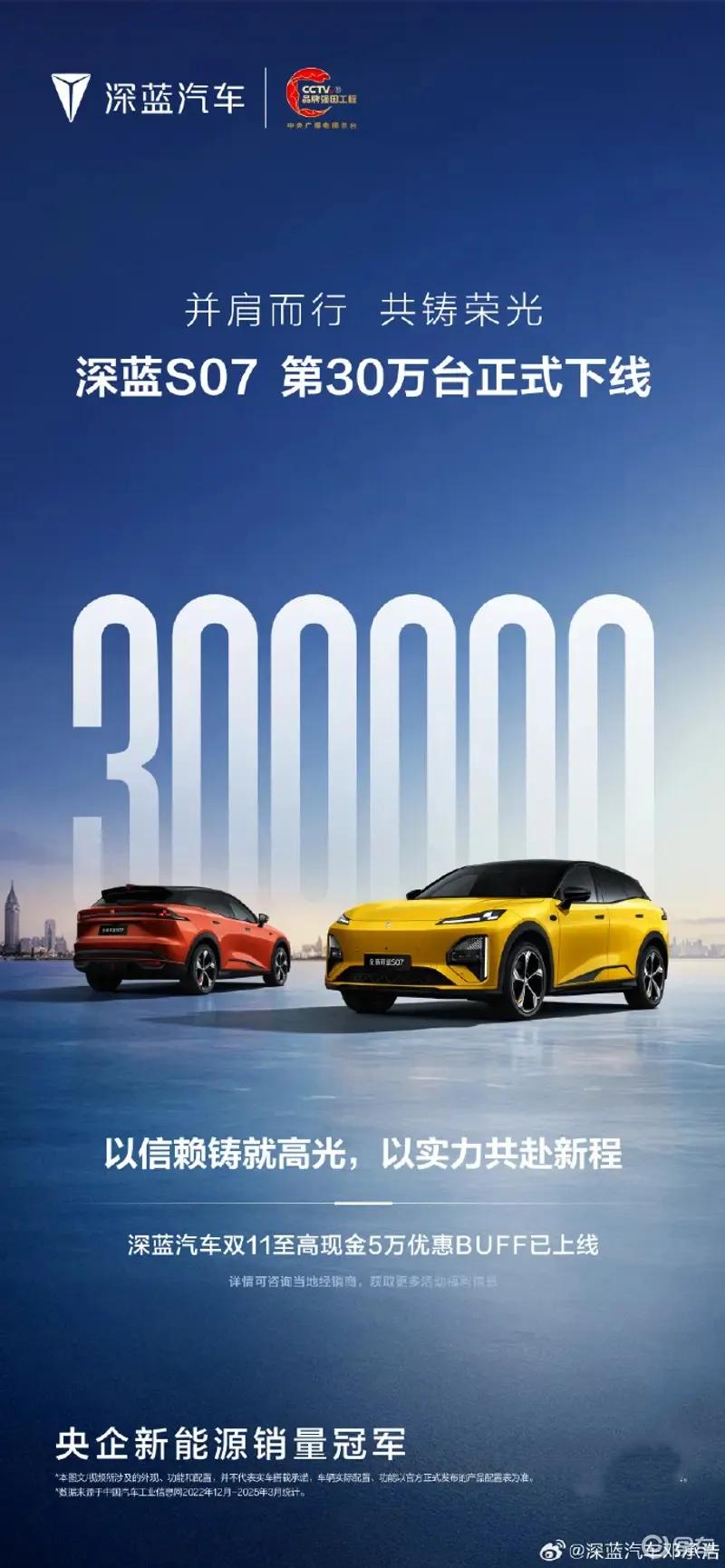 日前,长安深蓝汽车董事长邓承浩在社交媒体发布,深蓝S07第30万台正式下线。并表示,从0到300,000,这不仅是数字,更是一段共同走过的时间。感谢30万份信任,这是压力,更是动力。新款深蓝S07 于9月19日上市,共推出5款车型,售价区间15.69-17.39万元。