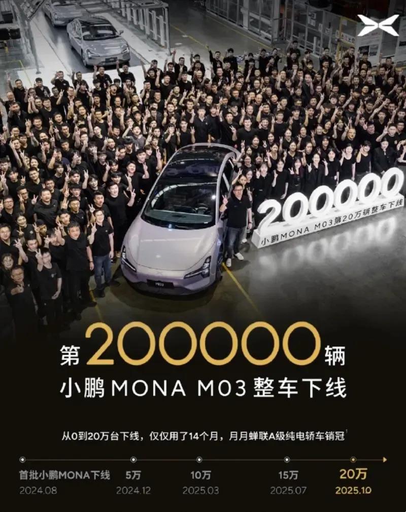 10月29日,小鹏汽车官方宣布,小鹏MONA正式达成20万台整车下线,用时14个月。上市至今,小鹏MONA连续14个月月交付过万。小鹏MONA M03 于8月27日正式上市,售价11.98-15.58万元。