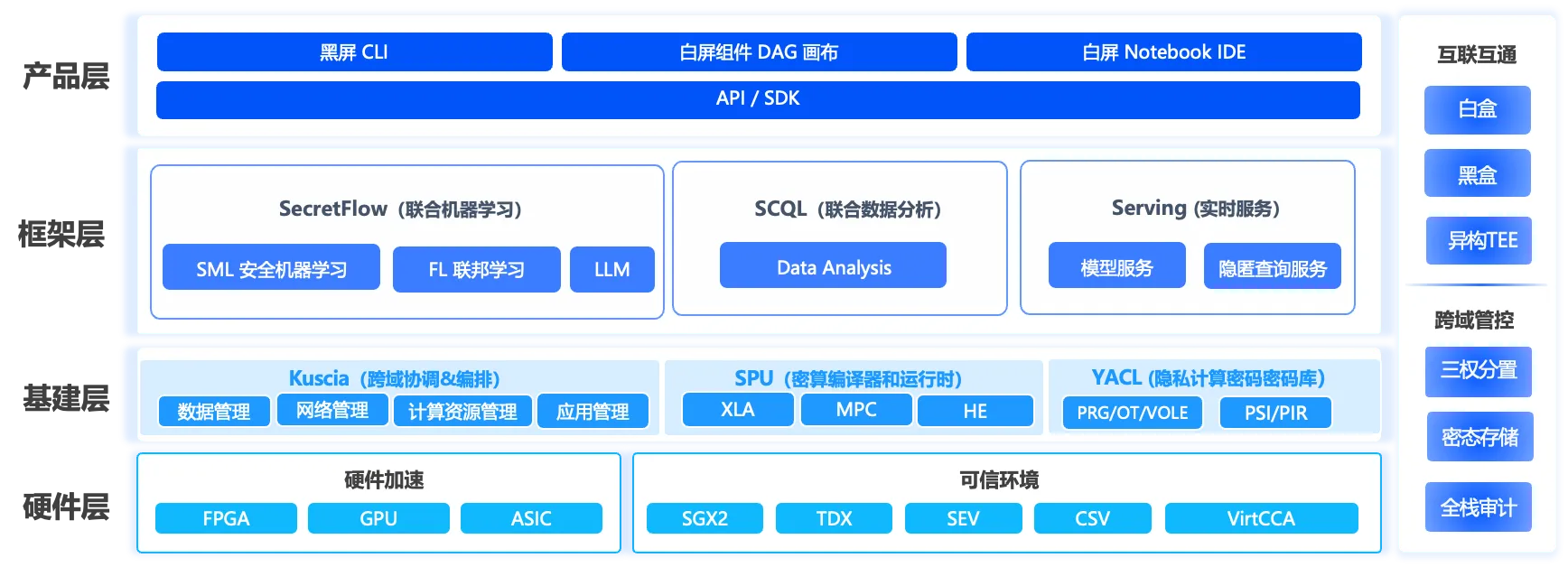 - 隐私计算平台,集成了隐语原有的MPC、PSI、PIR等多种隐私计算关键核心技术,以及联合数据分析(SCQL)能力。