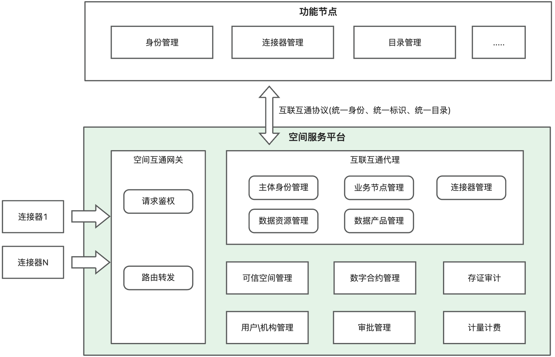 - **互联互通代理:**对接功能节点的身份管理、连接器管理、目录管理等模块,基于互通互联三统一(统一身份、统一标识、统一目录)的标准进行建设,主要代理的功能包括 1)主体身份、业务节点的身份管理 2)连接器管理 3)数据资源、数据产品的目录管理。