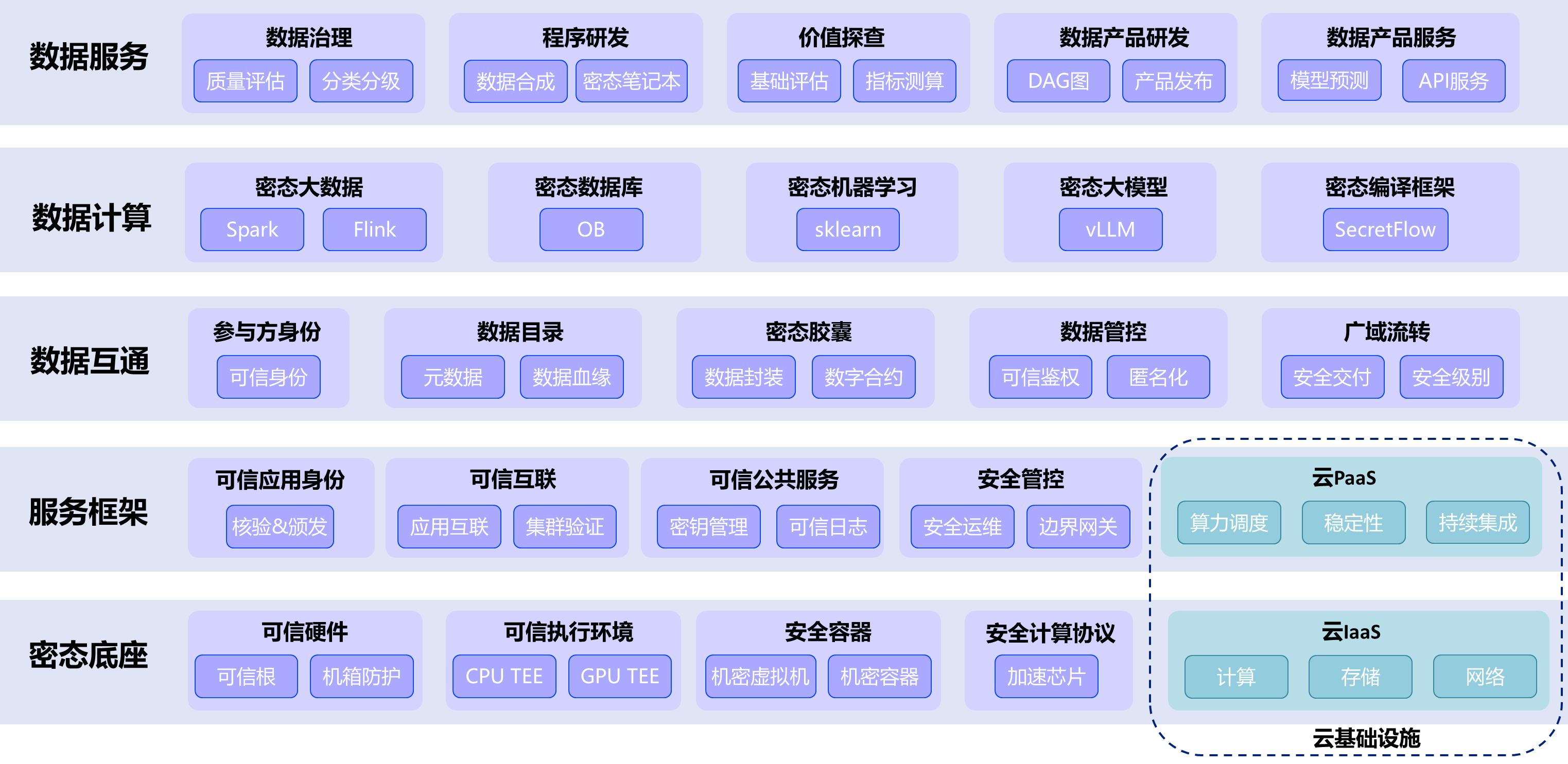 - 密态计算枢纽,提供基于TEE技术路线的密态计算平台,包括密态计算底座、可信应用体系、密态计算引擎、密态胶囊、密态数据开发服务平台在内的全栈功能。密态计算枢纽可以作为可信数据空间的密态数据托管环境和开发利用环境,支持数据供需双方基于密态进行数据交付,研发。