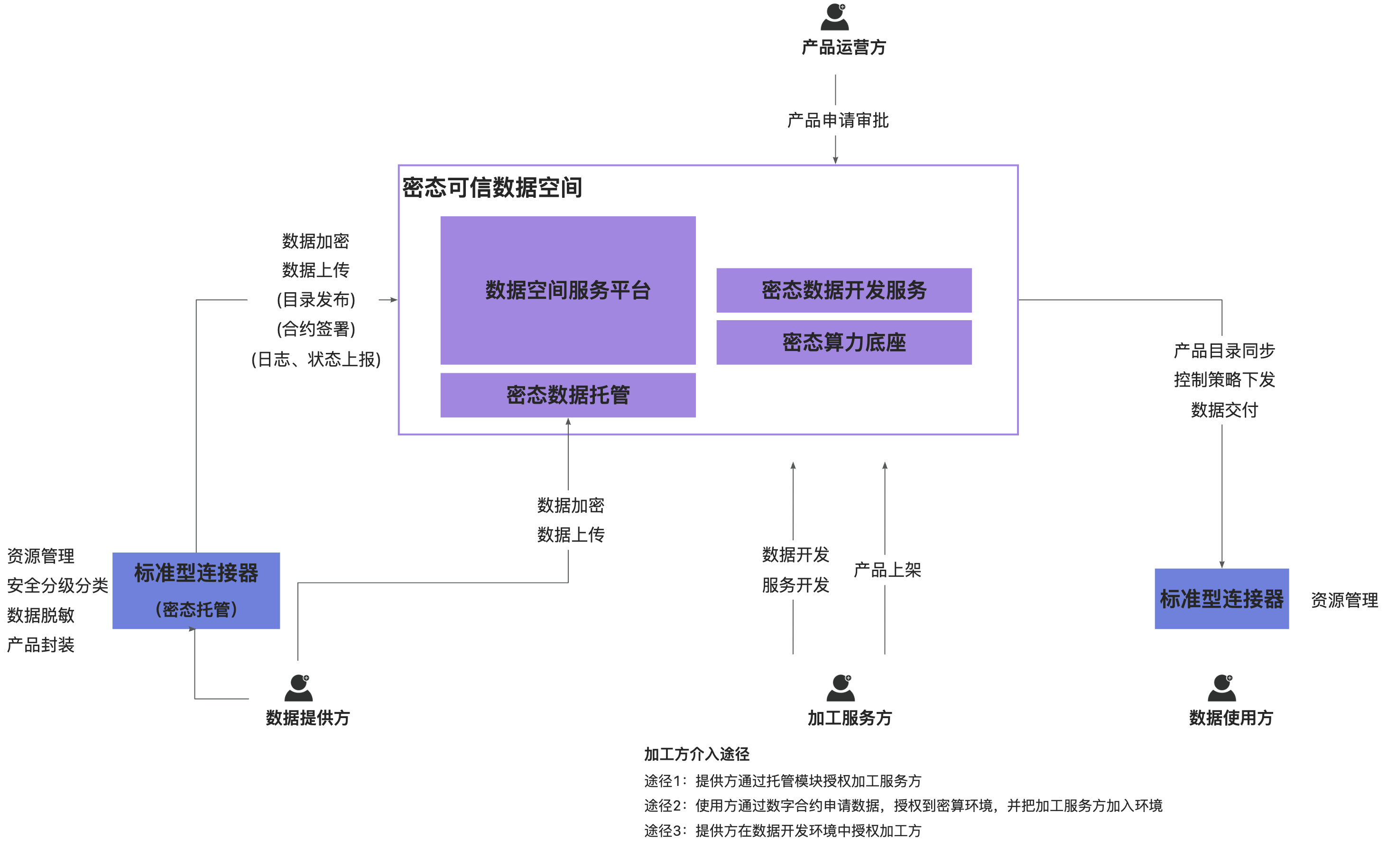 数据提供方、加工服务方、产品运营方、数据使用方等多方,通过密态可信数据空间完成数据托管、数据加工、产品上架、数据申请流程。