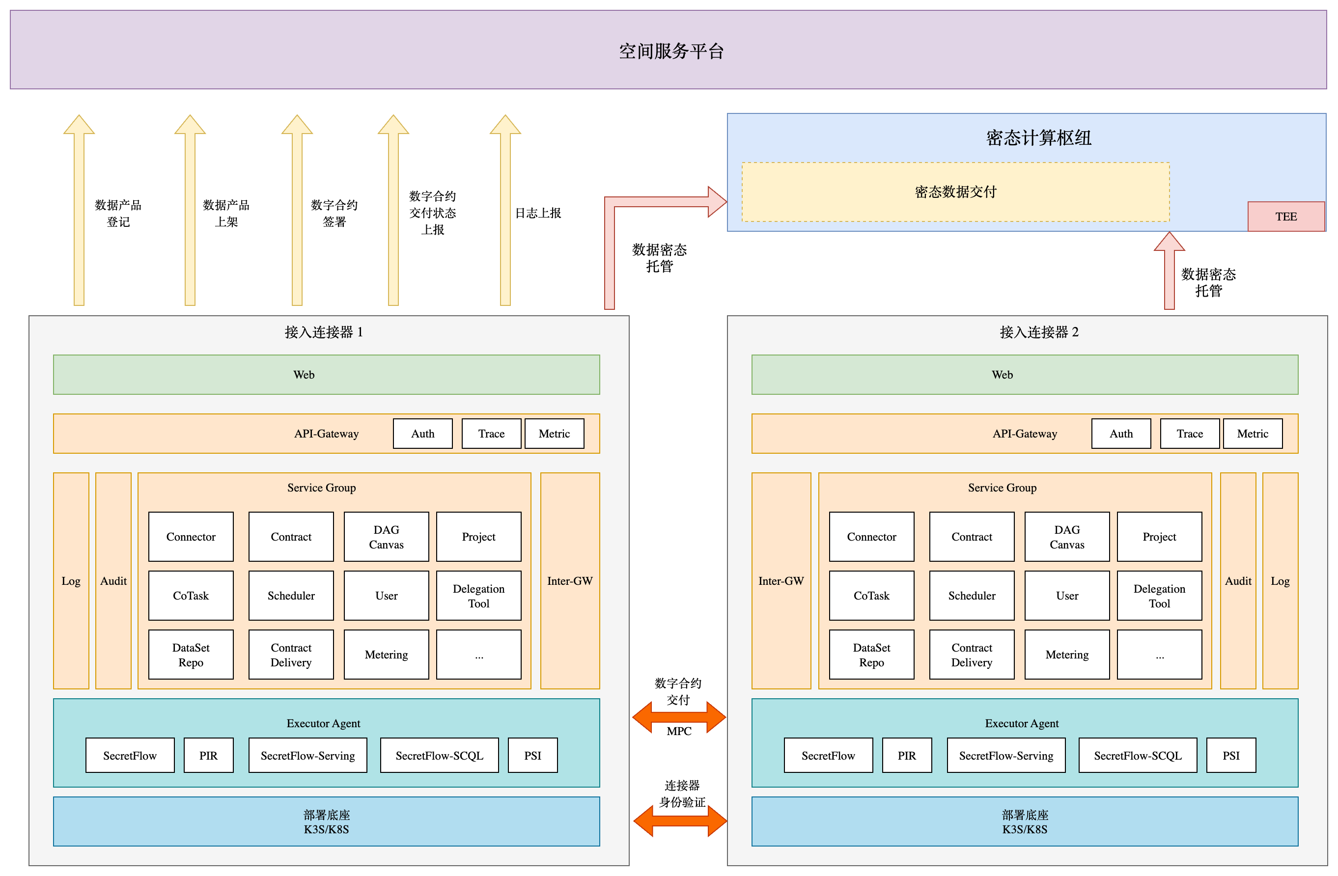 - 接入连接器,按照可信数据空间技术架构,隐语社区提供了符合《技术架构》要求的标准功能连接器,以及扩展隐私计算、密态计算、密态托管等功能的扩展型连接器。