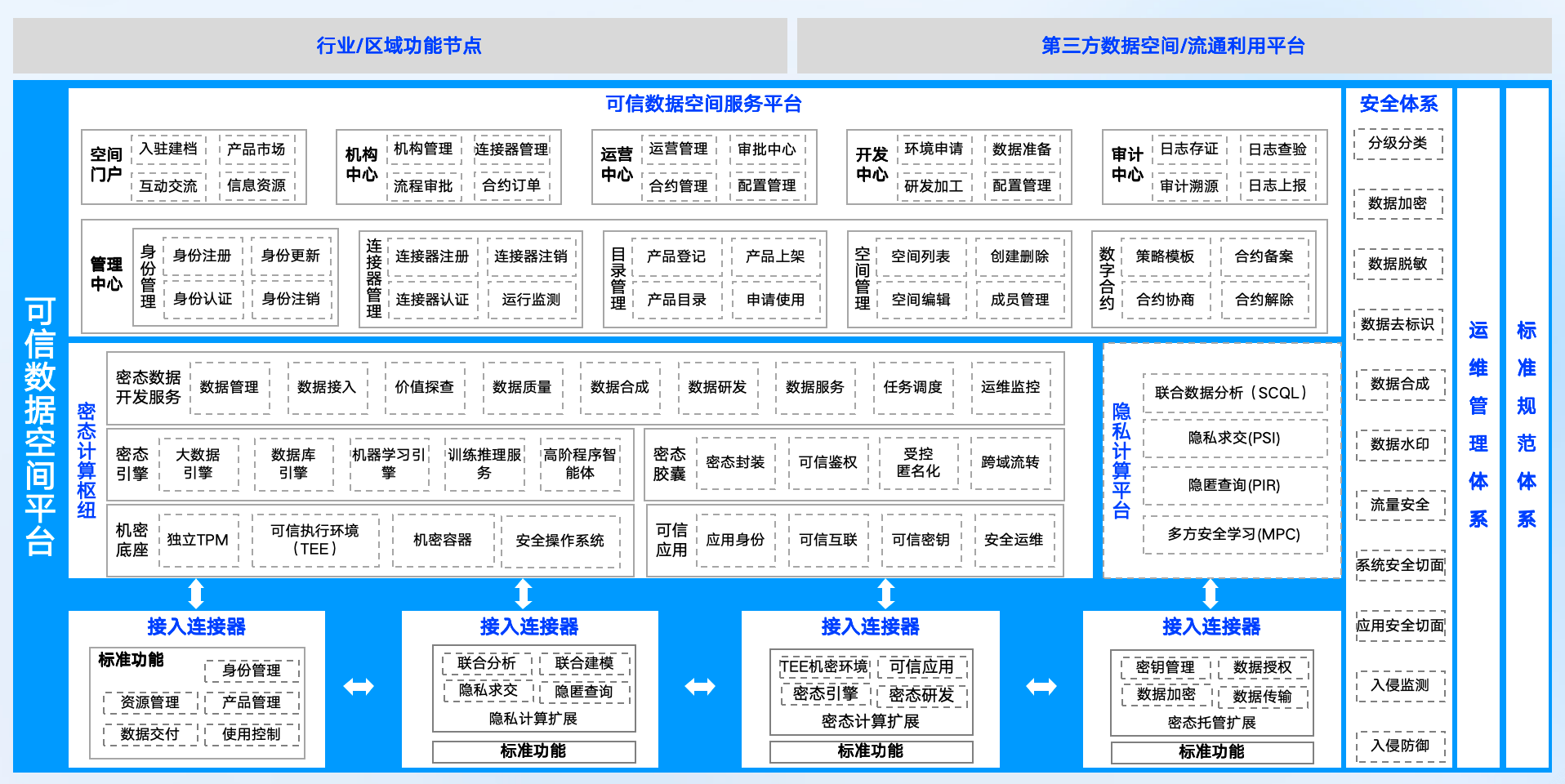 - 可信数据空间服务平台,包括空间服务门户和管理中心。空间服务门户是面向数据空间的各参与方提供业务应用入口,包括空间门户、机构中心、运营中心、开发中心、审计中心等。管理中心实现了身份管理、连接器管理、目录管理、数字合约管理、数据空间管理等功能。并支持按照“三统一”要求,保持身份、标识、目录与区域/行业功能节点的互联互通。