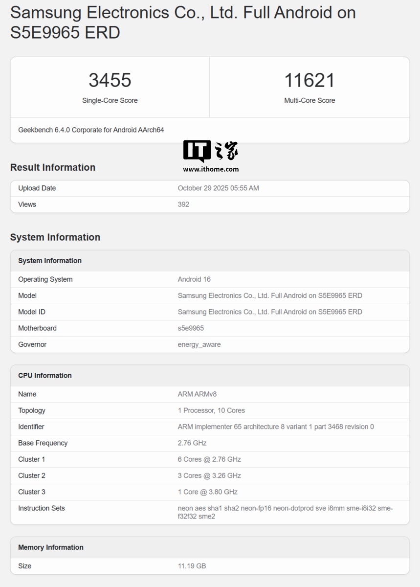 IT之家查询公开资料,代号为“S5E9965 ERD”的三星测试设备于昨日再次现身 GeekBench 跑分库,单核成绩为 3455 分,多核成绩为 11621 分,其多核分数已超越骁龙 8 Elite Gen 5 的平均水准。