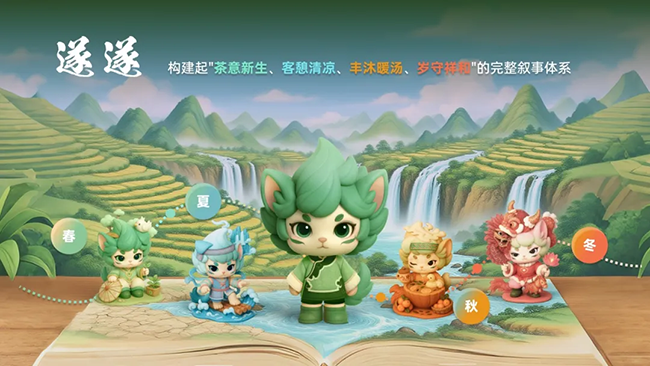 特等奖(擂主)获得者来自上海交通大学的参赛团队分享,“我们团队在暑假期间实地走进遂川县,深入了解红色圩场、桃源梯田、千年鸟道等多个地方的特色文化,以茶文化为魂、情感共鸣为脉、地域特色为肌理,设计出了以四季印象为主题的IP形象。作品基于阿里云 PAi Art Lab 平台构建了双线创作流程,在IP形象设计线上,先以原创草图为基础生成形象示例,经人工筛选校正后,在 ComfyUI 中完成IP主形象设计;风景建模线上,借助阿里云 PAI平台支持,单独训练了遂川风景 Lora 模型,最终在 ComfyUI 中整合两条工作流,实现了IP形象与遂川实景、特色产品的深度融合。从而构建起‘茶意新生、客憩清凉、丰沐暖汤、岁守祥和’的完整叙事体系。”