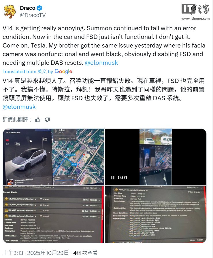 同时还有车主表示,他们的汽车在有时会出现 FSD 完全失效的现象,甚至车辆的前置摄像头也遭受牵连,直接变成漆黑一片,只能通过多次重启车机来恢复。