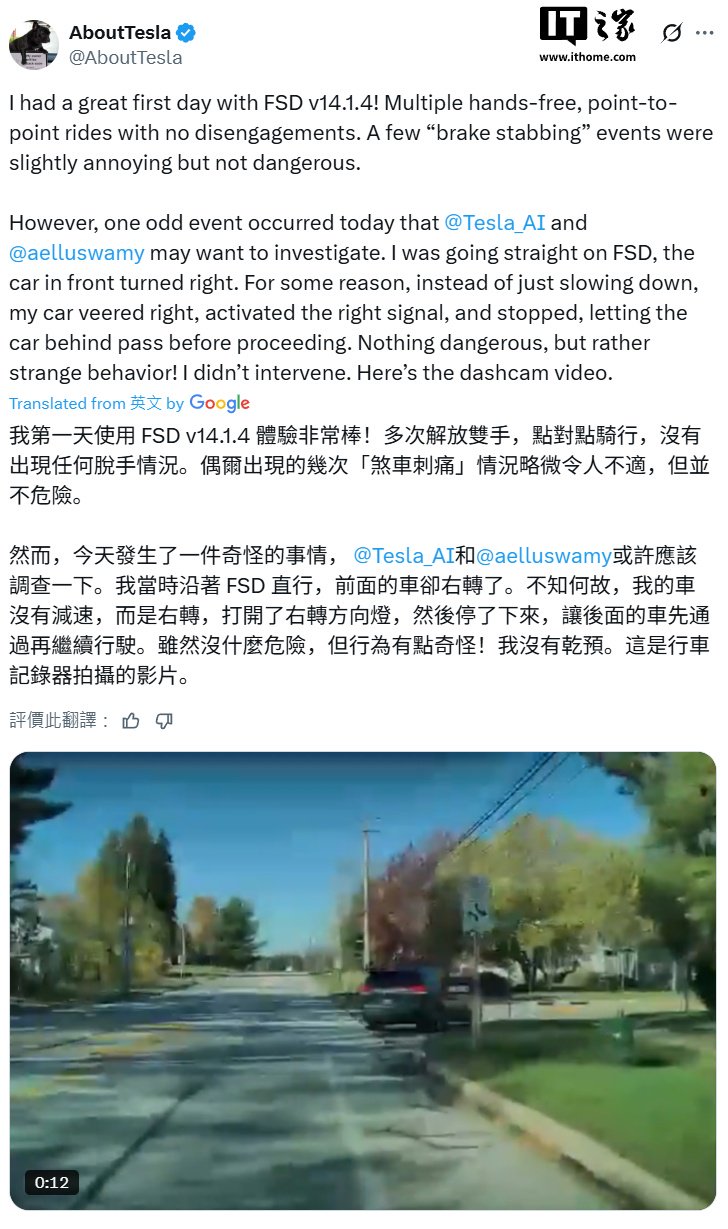 IT之家 10 月 29 日消息,据汽车媒体 electrek 今天报道,特斯拉在本月上旬推出了 FSD 年度大更新 V14,不过其“脱手驾驶里程”提升幅度远低于预期,部分内测用户反馈他们的汽车安装后出现了“幻觉”现象,会在路边随机刹停。