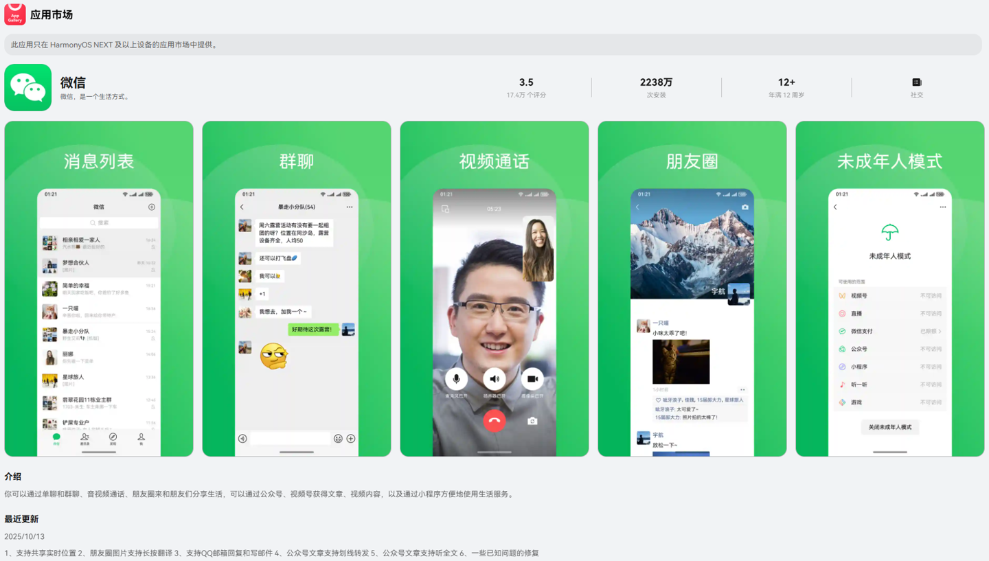 微信鸿蒙版 App 于今年 1 月正式登陆华为鸿蒙应用市场 App Gallery,支持基础通讯、社交、微信支付、公众号、小程序、视频号、直播等主要功能。目前,微信鸿蒙版已全面支持面容 / 指纹识别支付。