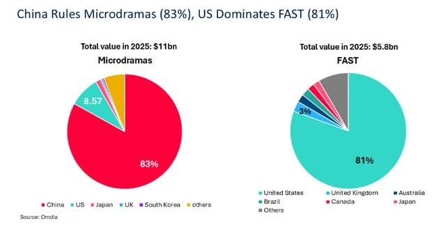 分析显示,微短剧——每集时长通常在2-3分钟的短篇系列故事——已成为移动优先视频娱乐中的一个主要类别。预计该形式的收入规模几乎是免费广告支持流媒体电视(FAST)频道的两倍,Omdia预计后者在今年年底将达到58亿美元。