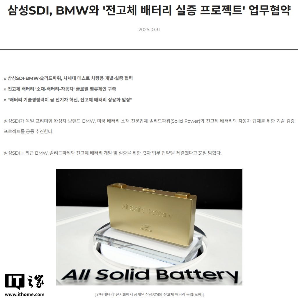 IT之家 10 月 31 日消息,三星 SDI 于 10 月 30 日宣布,与德国高端整车品牌宝马(BMW)、美国电池材料专业企业 Solid Power 签署“三方业务协议”,共同推进全固态电池车载技术验证项目。