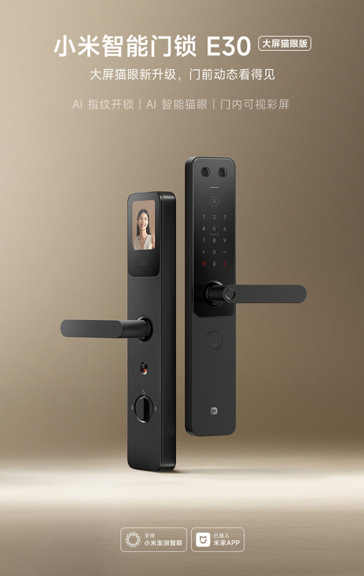 小米智能门锁 E30 大屏猫眼版开售于 2024 年 10 月 31 日,支持 AI 指纹识别开锁、智能猫眼、可视彩屏,发售价为 1299 元。