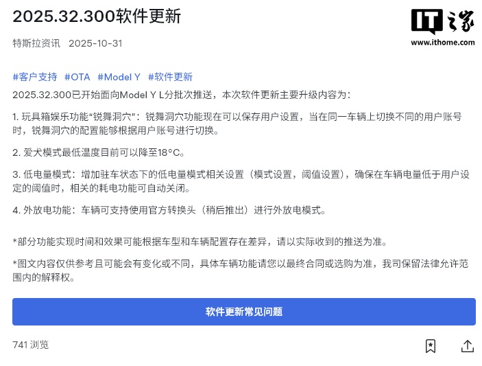 IT之家 10 月 31 日消息,特斯拉今日宣布向 Model Y L 推送最新的 2025.32.300 软件更新,正式支持「外放电」功能。