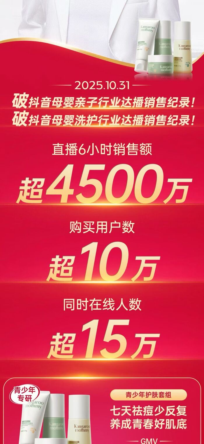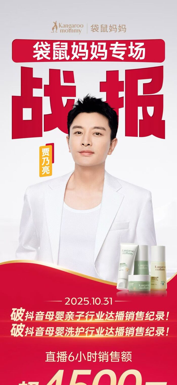 【亿邦原创】10月31日,贾乃亮&袋鼠妈妈抖音直播专场中,6小时直播销售额达4500万元,破抖音母婴亲子行业达播销售记录,购买用户数超10万,同时在线人数超15万。