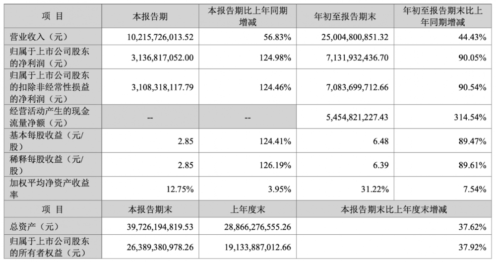 2025年前三季度营业收入250.05亿元,同比增长44.43%;净利润71.32亿元,同比增长90.05%;扣非净利润70.84亿元,同比增长90.54%。前三季度营业收入增长主要原因是算力基础设施建设和相关资本开支的增长带来800G等高端光模块销售的增加。