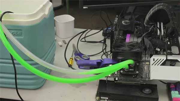 TrashBench使用了汽车防冻液作为冷却介质,他将定制的水冷回路中注入了50/50比例的乙二醇汽车防冻液混合物,并在冰箱中预先将其冷却。