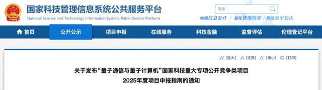 《关于发布“量子通信与量子计算机”国家科技重大专项公开竞争类项目2025 年度项目申报指南的通知》原文如下: