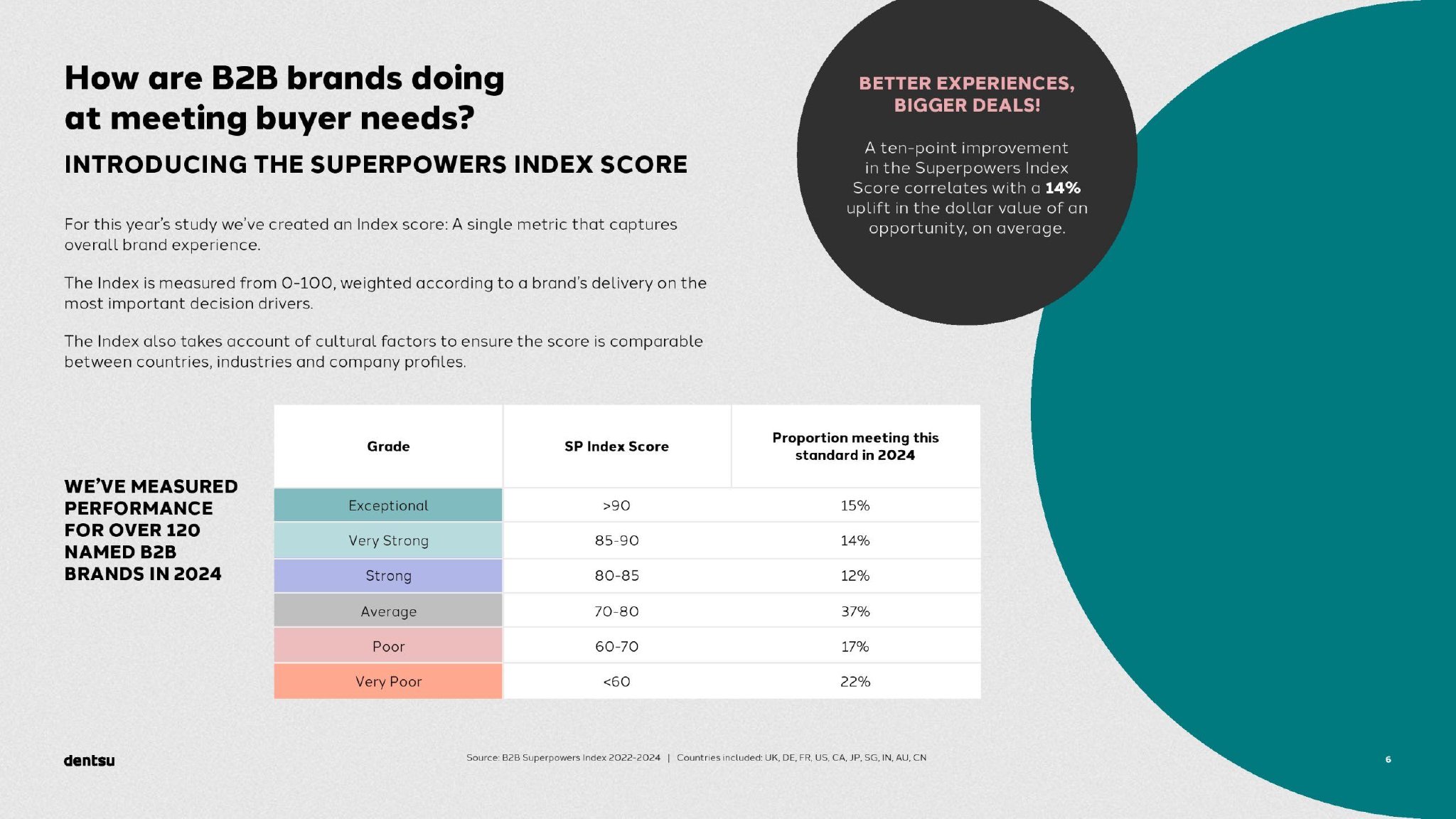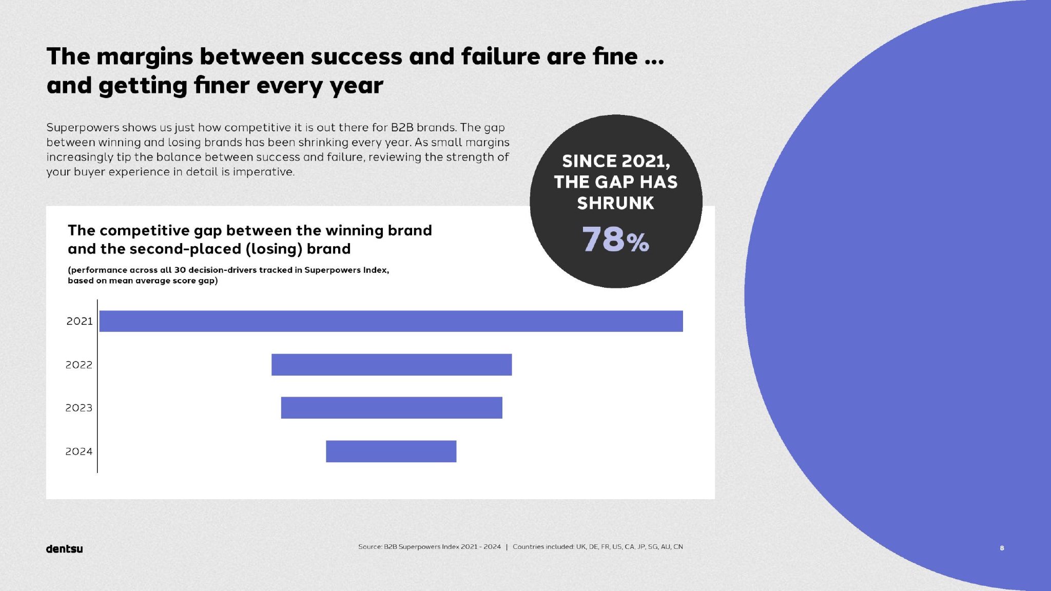 Dentsu的报告调查了自2021年以来约1.4万名B2B买家的购买体验。报告指出,自2021年以来,顶级品牌与排名第二的竞争对手之间的表现差距缩小了78%。
